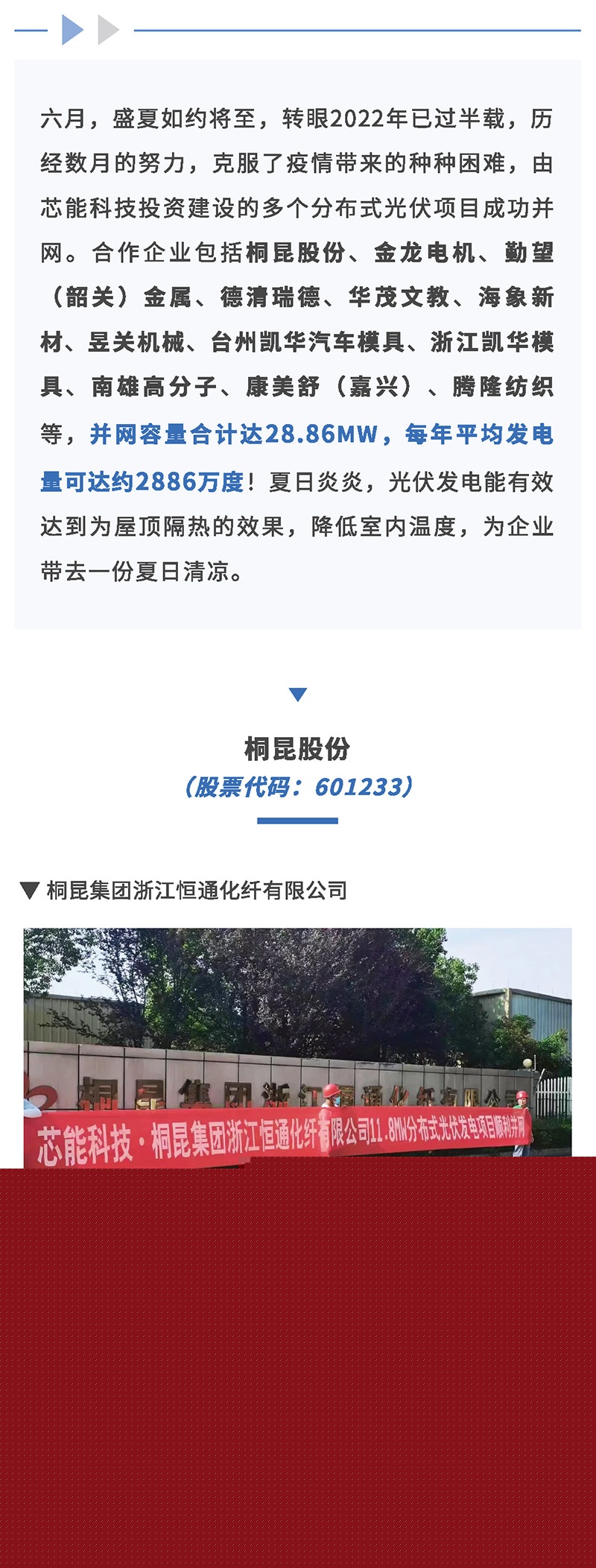 28.86MW!桐昆股份、金龍電機(jī)、海象新材等多個分布式光伏項(xiàng)目成功并網(wǎng) 2022-06-20 00:00:00 浙江芯能光伏科技股份有限公司 Viewd 6443 Previous賽峰集團(tuán)3.82MW分布式光伏項(xiàng)目順利開工 Next芯能科技黨支部開展“追溯紅色記憶,汲取奮進(jìn)力量”主題黨日活動