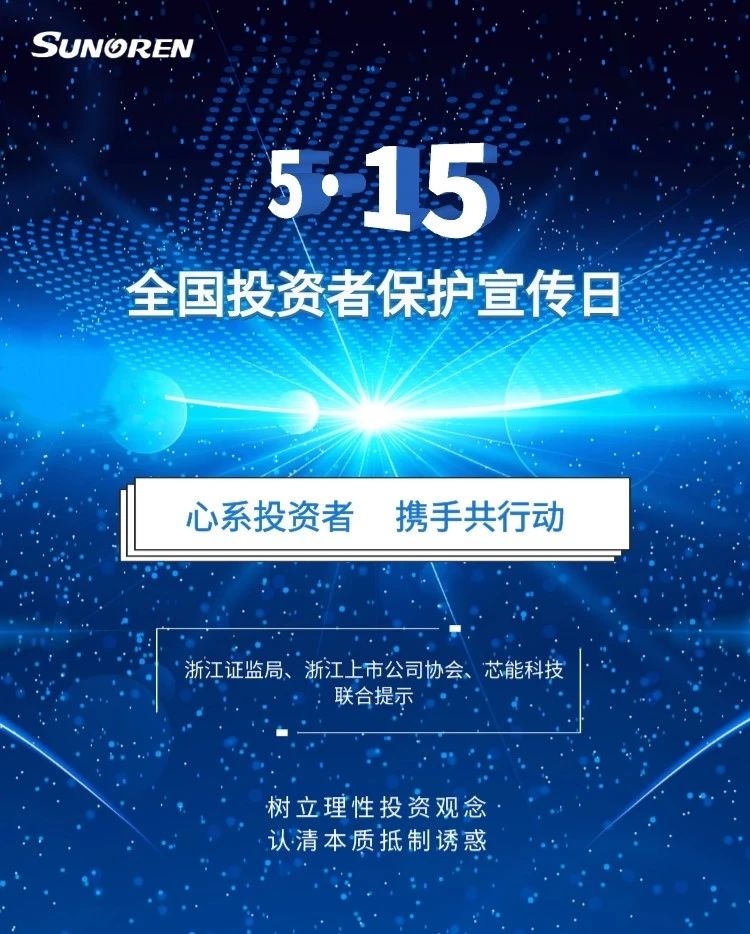 “5·15”心系投資者,攜手共行動 2021-05-15 00:00:00 浙江芯能光伏科技股份有限公司 瀏覽次數(shù) 11884 上一條一起學(xué)新法:新設(shè)投保專章,夯實(shí)制度保障 下一條“3·15”保護(hù)投資者合法權(quán)益,芯能在行動