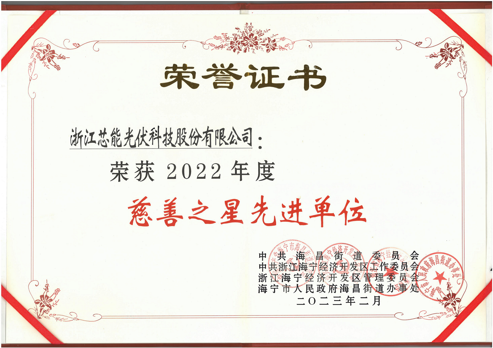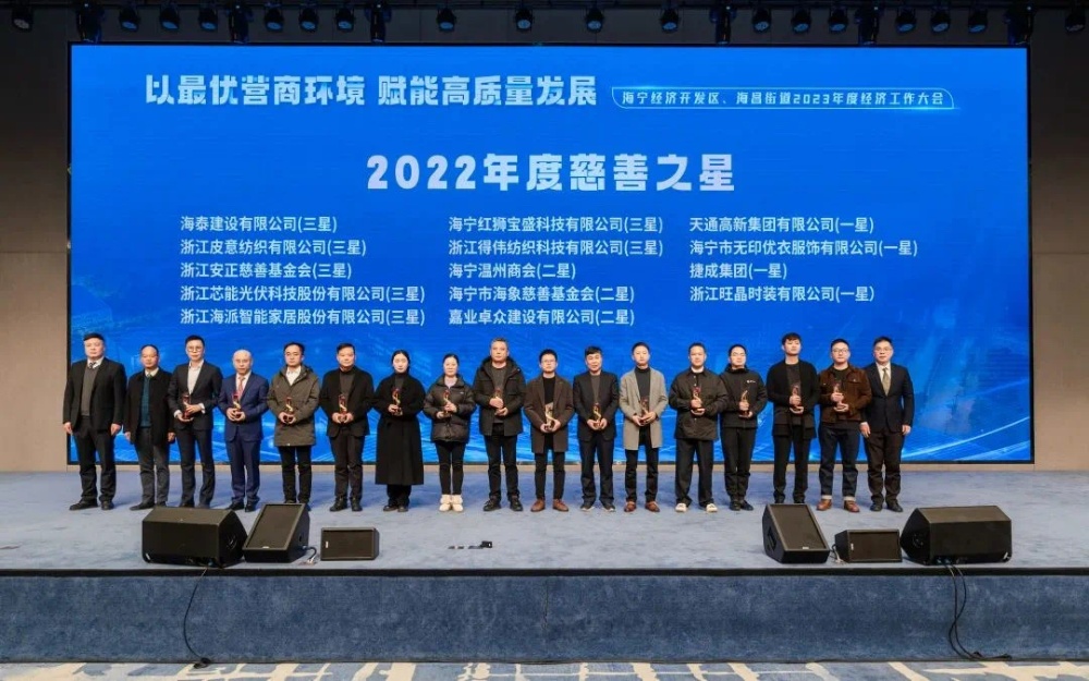 2023年2月8日,在海寧經(jīng)濟(jì)開發(fā)區(qū)、海昌街道“以最優(yōu)營(yíng)商環(huán)境 賦能高質(zhì)量發(fā)展”2023年度經(jīng)濟(jì)工作大會(huì)上,芯能科技榮獲2022年度明星企業(yè)和慈善之星先進(jìn)單位。